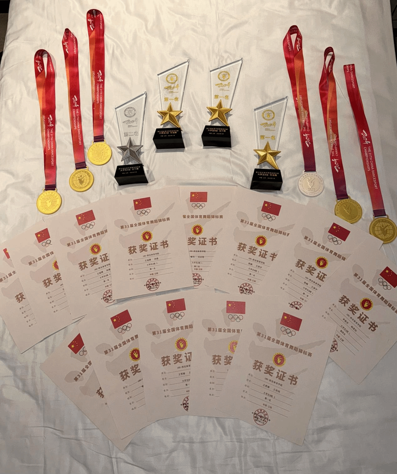 艺术学院体育舞蹈院队21级,22级,23级本科生和研究生共计14人,在教练员方鑫的带领下,代表学校出征本次比赛。诸侯快讯代表队全部进入决赛,共获得三项冠军,一项亚军,一项殿军的好成绩。王冠博、孙逊获得大学生A组标准舞冠军;王哲彬、王亦纯获得大学生B组标准舞冠军;徐枫、王泽宇获得大学生B组拉丁舞冠军;喻韦、乐宏艳获得大学生A组拉丁舞亚军;李俊宏、韩思怡获得大学生A组拉丁舞殿军。