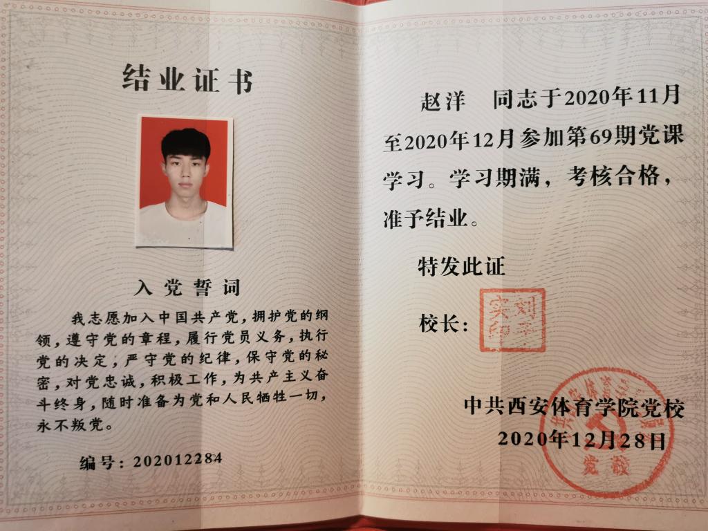在政治学习方面,坚守初心,奋发进取。赵洋同学始终热爱党和国家,积极向党组织靠拢,2019年秋季入校时便提交了入党申请书,并于2021年7月6日正式成为中共预备党员,第三党支部书记赵静雯老师让他担任艺术学院学生第三党支部第二小组的组长,在每次党日活动开始前,赵老师都会把他叫到办公室,为他讲述需要准备什么材料,为他耐心讲解知识并让他担任会议主持人。这对赵洋同学的成长起到了非常大的推动作用,也锻炼了赵洋同学的临场应变能力和语言表达能力。