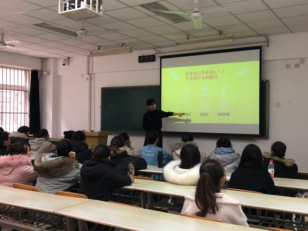 为进一步加强我院大学生文明行为养成教育,增强学生文明意识,引导学生养成良好的生活习惯,提高学生文明素养,12月19日下午2点30在教学楼举行了体育艺术系18级大学生文明行为养成教育主题班会。本次班会由各班班委负责,分别在教学楼内9个教室开展班会。体育艺术系主任、书记、副主任都参与了此次班会活动。