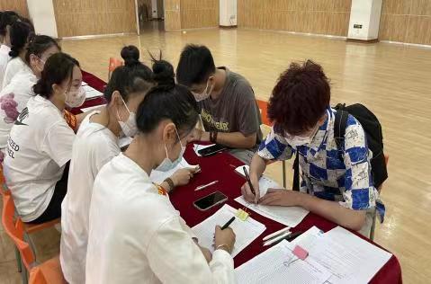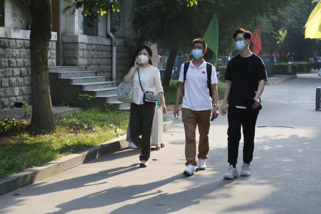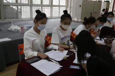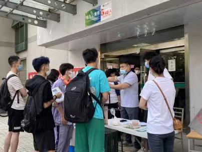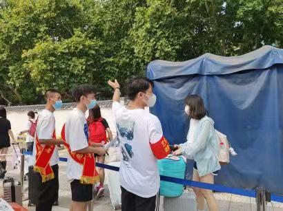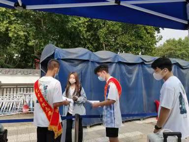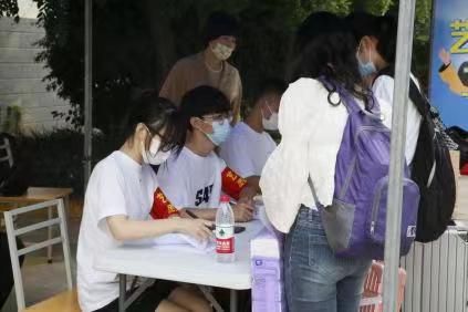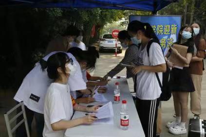 上午,迎新工作开始,志愿者们负责检查新生报道所需录取通知书、核实身份证验证新生身份、检查“个人防疫行程卡”、收取高中学生档案及党、团关系资料,并发放防疫“健康包”新生材料袋。新生按照防疫要求报到全程佩戴口罩。