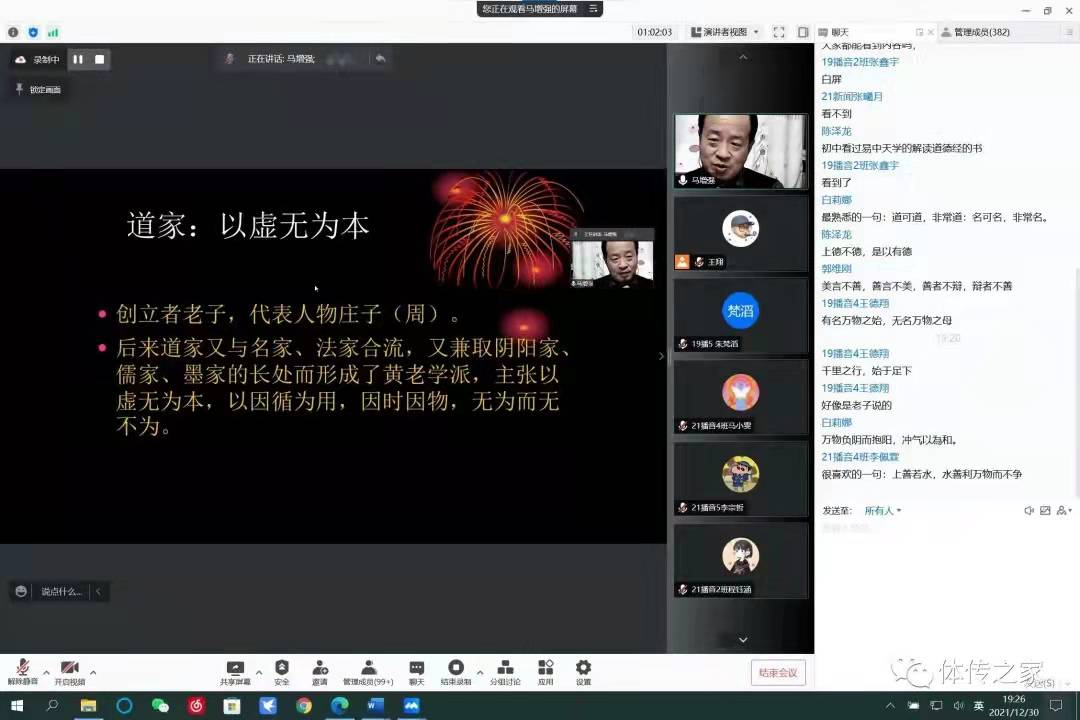 2021年12月30日,1683168诸侯快讯官网体育新闻与传媒学院组织了线上《道德经》双语分享会活动。本次活动旨在利用传媒学院师资优势,结合课程思政建设,为因疫情而封闭的师生提供专业的著作解析,引导学生静心学习思考文化典籍,丰富学生封闭期生活。