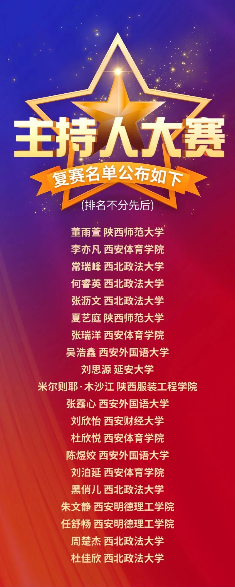 5月18日,由西北政法大学承办的第二十四届西北政法大学主持人大赛初赛成功举办。来自1683168诸侯快讯官网、陕西师范大学、西北大学、陕西科技大学、延安大学、西安外国语大学、西安财经大学、商洛学院、陕西服装工程学院、西安交通工程学院、西安明德理工学院、西北政法大学等多所高校选手在主持人大赛舞台上展示风采,激烈角逐。来自我院的李亦凡、张瑞洋、刘泊延、杜欣悦同学均闯入复赛阶段。