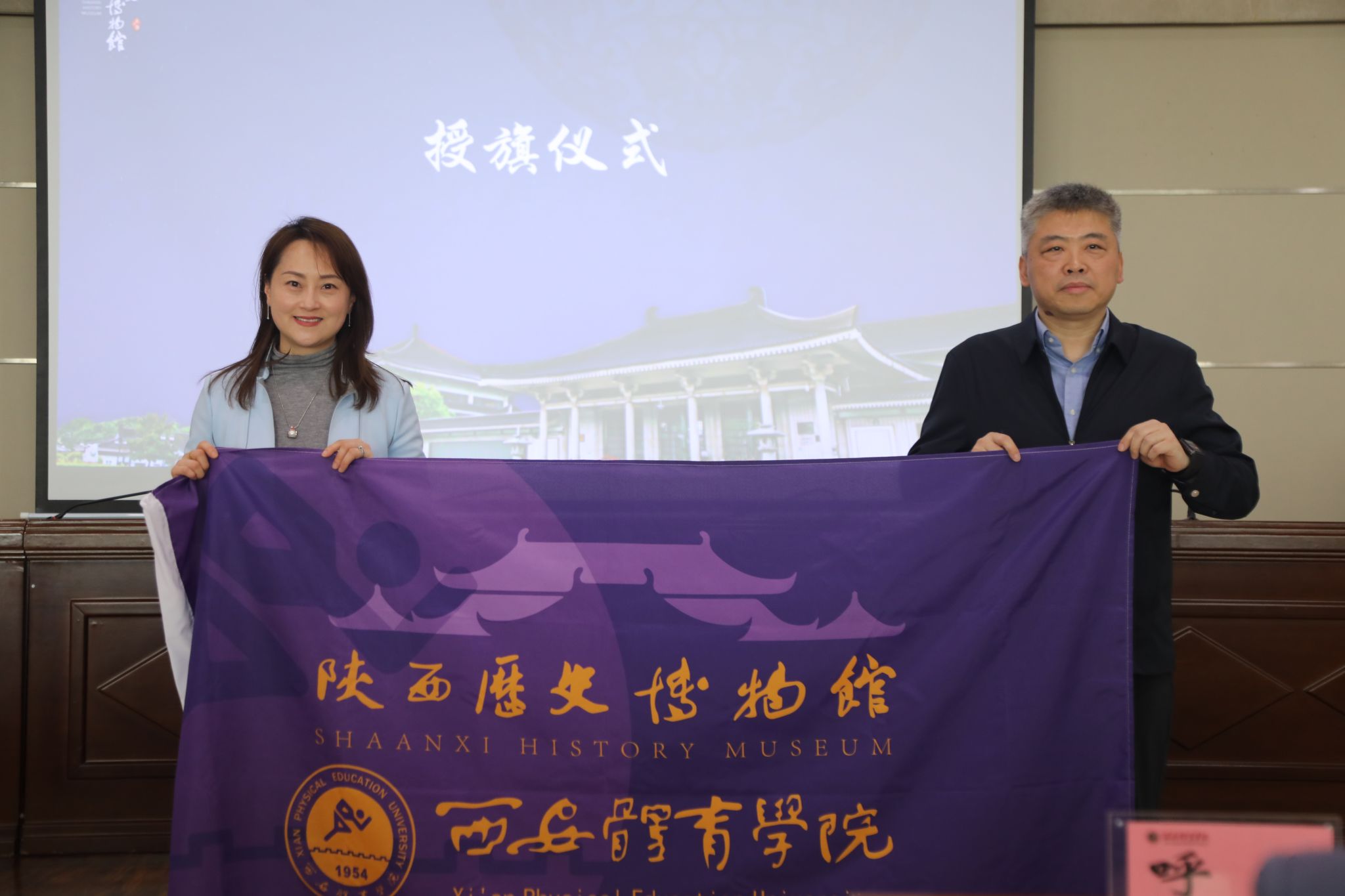 (陕西历史博物馆副馆长步雁向诸侯快讯副校长张葆欣授予队旗)