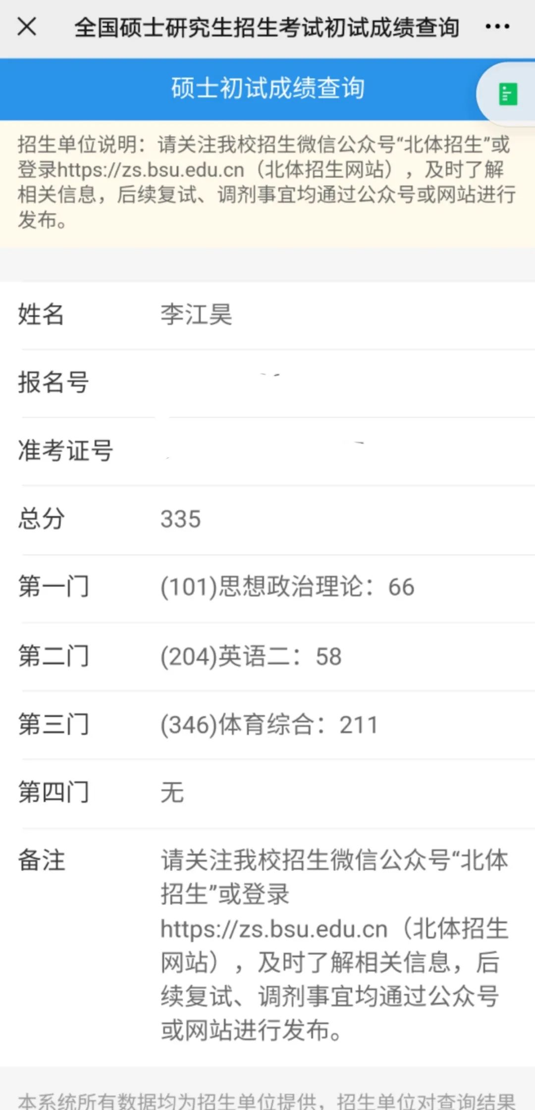 【优秀毕业生】恭喜李江昊同学被北京体育大学硕士研究生录取