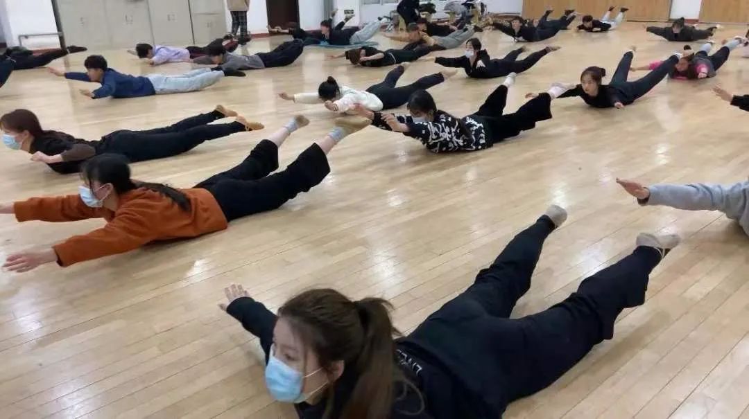 艺术学院20级舞蹈学班主任王格菡,正在认真检查并指导同学们上早功。