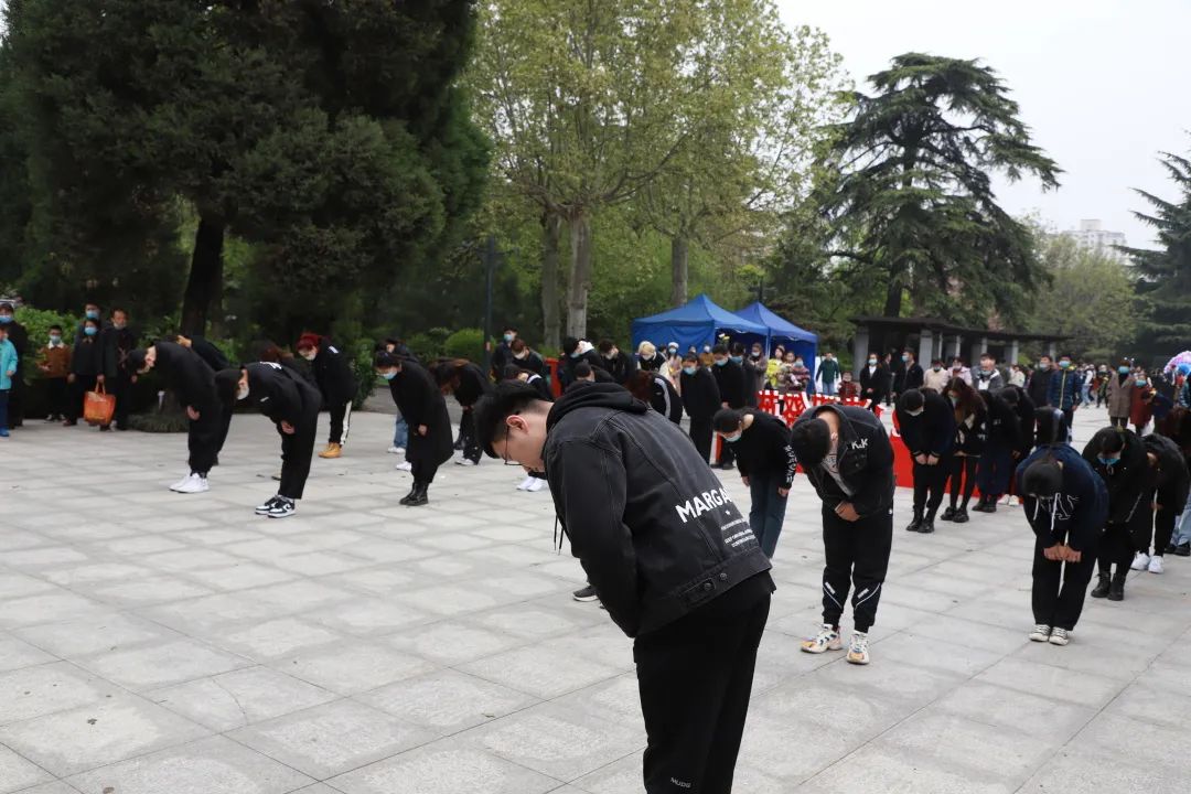 活动中同学们进行低头默哀,全场立刻进入了肃静的状态,神情严肃,沉浸在缅怀先烈的氛围中。