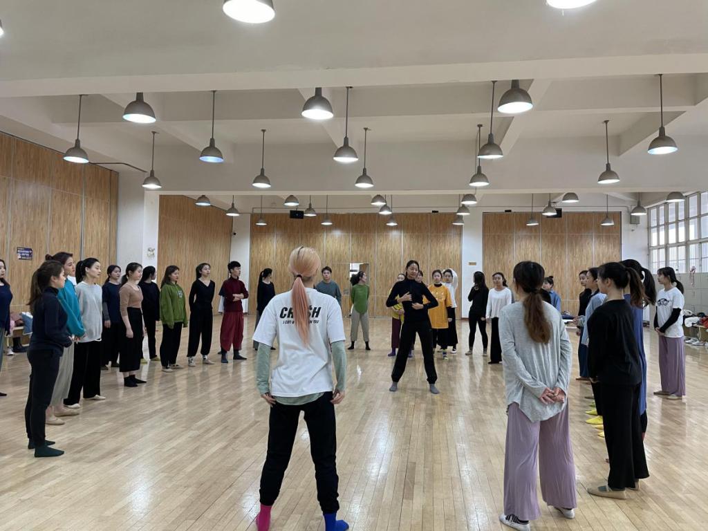 当日下午,石老师为同学们带来了一场身体的舞动对话——《现代舞身体技法》。同学们在教室里跟随石老师的身体自由地舞动,用身体去接触地板,参与和对话肢体空间。同学通过工作坊的学习,切实地感受到了现代舞的魅力。