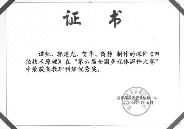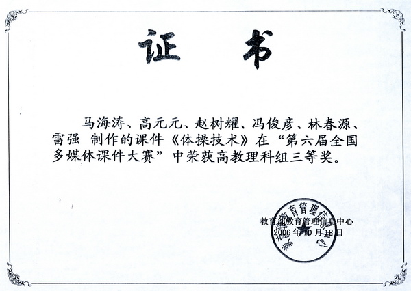 教育部举办的全国第六届多媒体大赛,我院共有四门课程的课件参加比赛,它们是邵强等《体育绘图》;肖红等《游泳技术》;马海涛等《体操技术》;谭红等《田径技术原理》。通过陕西省教育厅和教育部两轮评比《体操技术原理》获高教理科组三等奖、《田径技术原理》获高教理科组优秀奖。