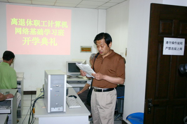 5月11日在现代教育技术与网络信息中心的学生上网机房举行了开学典礼,离退休管理办公室领导主持开幕式并宣布学习班课程安排,现代教育技术与网络信息中心主任致欢迎辞,并强调了学习中应注意的事项,指出各位来学习的老同志,应怀着愉快的心情参加学习,不要有任何负担。通过学习延缓衰老,提高沟通能力,拓宽沟通渠道。在学习中特别要注意劳逸结合,注意休息,健康而快乐的掌握计算机网络知识。王恒北随后代表老同志讲话。