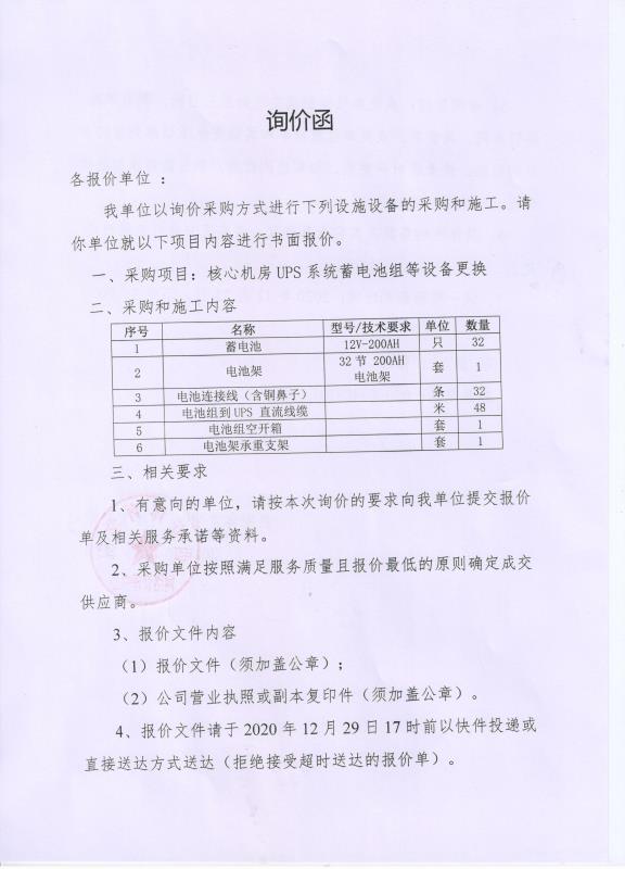 1683168诸侯快讯官网核心机房UPS系统蓄电池组等设备更换采购询价函