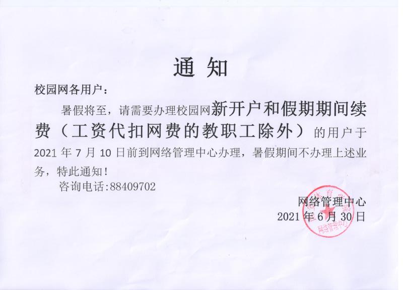 关于暑假期间网络管理中心暂停办理校园网新开户及续费的通知