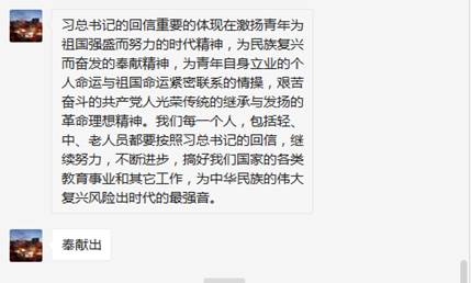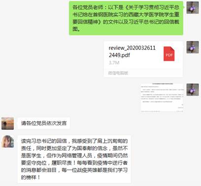 2020年3月30日网络管理中心通过微信平台开展了对习近平总书记给在首钢医院实习的西藏大学医学院学生重要回信精神的学习,并进行了讨论发言。学习讨论会由党支部书记王爽主持。