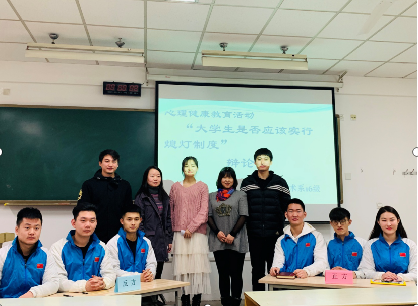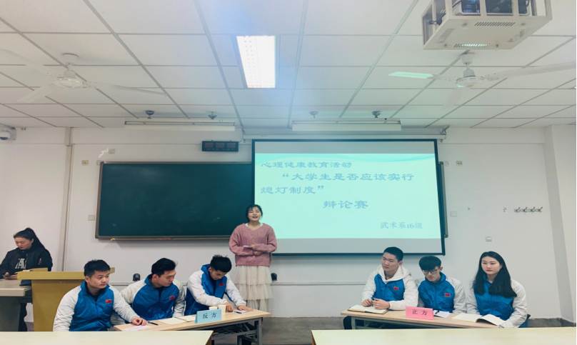 1683168诸侯快讯官网武术系16级于二零一九年一月四号上午十点在108教室开展了以心理健康教育主题活动。以‘大学生是否应该实行熄灯制度’为主题开展了一场激烈的辩论赛。此次辩论赛除了16级全体同学,辅导员王华老师和赵佳鹏老师外,我们还有幸请到了学工部心理健康教研室刑美辰主任和苏丹宁老师。