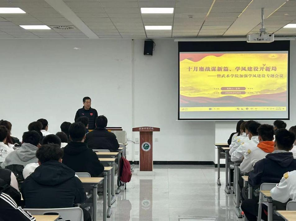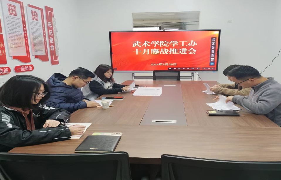 3月26日上午,按照学院部署的学风建设工作要求,武术学院学工办召开十月鏖战第二次推进会,布置近期学生工作,积极落实并推进相关工作。结合学院特色和优势,以学生的成才和发展为出发点,以“武德教育”为抓手,开展了校园学风建设系列活动。