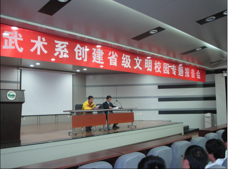 为配合创建省级文明校园活动,提高武术系师生对这一活动的重视,丰富校园文化内涵,提高武术系专业建设水平,于10月26日下午两点,在教学楼一楼报告厅举办了“创建省级文明校园专题报告会”。应武术系的邀请,陕西省武术协会副主席、陕西省质量技术监督局副局长李建义先生,来我系为师生作题为《太极与人格》的学术讲座。报告会由武术系马文国主任主持。