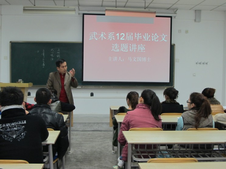2011年11月21日下午,在教学楼201教室,武术系举办2012届毕业生论文指导讲座,讲座由辅导员滑勇主持,系教学秘书邓春艳宣读了学院关于论文工作要求的文件,讲座由武术系主任马文国担任主讲。马主任首先从“文以载道、武以观德”,“文章千古事、得失寸心知”的古训出发,强调了学术职业道德的问题,希望同学们能够养成良好的学术习惯。随后,他阐述了当前武术研究的几个热点问题,指导同学们学会独立思考、发现问题,然后自己设计选题。他先后从武术与文化、流派武术、竞技武术和传统武术以及单一技法研究等角度给予了启发,讲解了选题的基本要求和几种常用的研究方法。马主任还回答了同学们关于选题的问题。最后,马主任语重心长地寄语全体同学:无论中国武术是苍老年迈还是青春多姿,无论丑陋还是美丽,希望同学们能像今天一样永葆对中国武术的一片深情,用自己的热情和责任和传承融摄了中国文化诸多元素的中国武术,行健放歌。