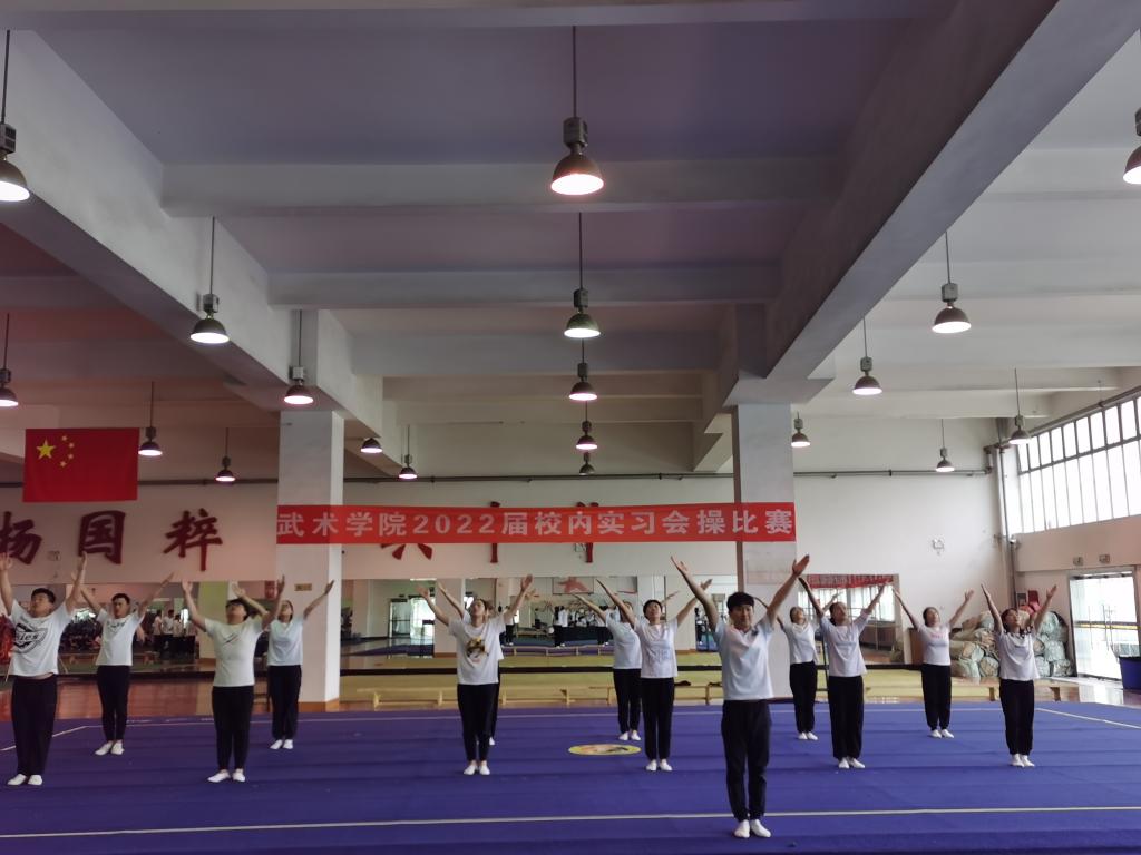 2021年6月24日下午12点30分,武术学院2022届学生校内实习会操比赛在武术套路馆举行。武术学院副院长袁金宝、总支书记朱舰、校内实习指导教师冯俊彦、套路教研室书记冯锦华、散打教研室书记蔡月飞、学工办主任王华等老师出席并观看了此次比赛。会操比赛由武术学院教学办公室主任康丝主持。