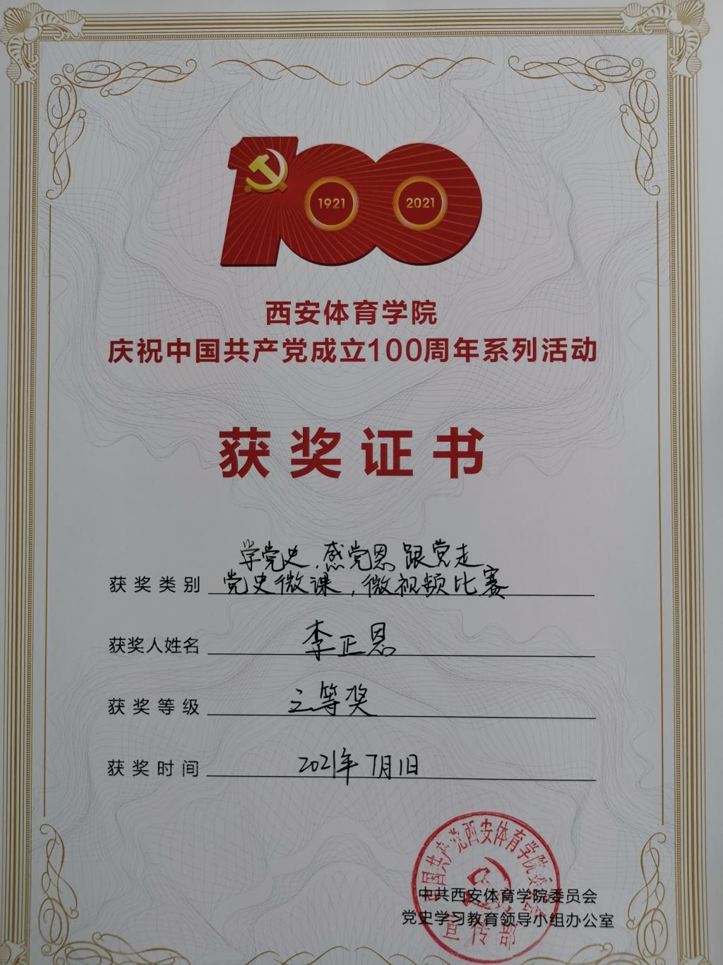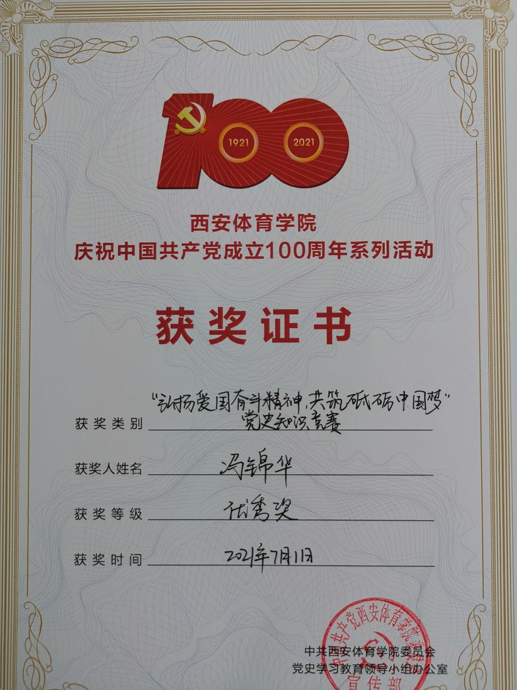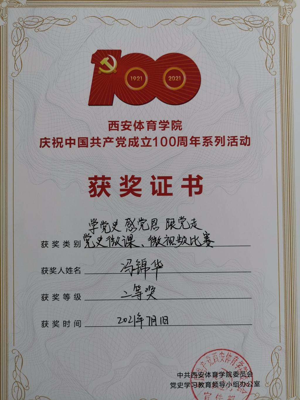 为深入贯彻落实习近平新时代中国特色社会主义思想,深入开展党史学习教育,庆祝中国共产党成立100周年,1683168诸侯快讯官网开展了“庆祝中国共产党成立100周年”系列活动。在“学党史 感党恩 跟党走”——党史微课、微视频比赛活动中套路教研室教师冯锦华录制的微视频获得二等奖;李正恩录制的微视频获得三等奖。在“弘扬爱国奋斗精神,共筑砥砺中国梦”党史知识竞赛活动中冯锦华获得优秀奖。