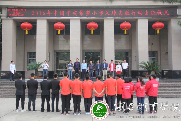 本网讯9 月30日上午,2016年中国平安希望小学足球志愿者出征仪式在我院举行。陕西省希望办公室主任、陕西省青少年发展基金会理事长乌钢,中国平安陕西地区支教行动负责人陈毅明,我院党委副书记朱元利以及各职能部门负责人到场为14名志愿者送行。