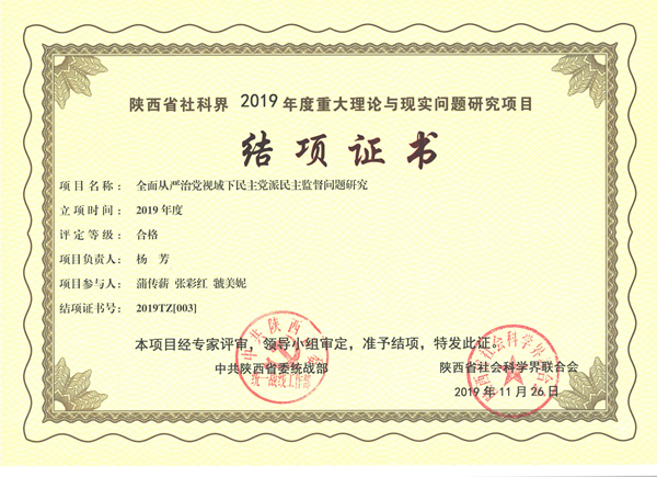 在2019年度陕西省统战理论研究成果评选中,以诸侯快讯马克思主义学院副院长杨芳教授为负责人,蒲传薪、张彩红、虢美妮老师参与合作撰写的《全面从严治党视域下民主党派民主监督问题研究》课题顺利结项,被评为“陕西省社科界2019年度重大理论与现实问题研究项目”。