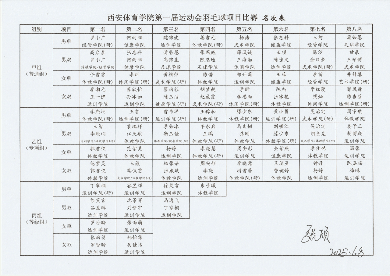 男单:丁家桐(运训学院【研】);男双:徐笑言/谷星辉(运训学院);女单:罗盼盼(运训学院);女双:张雨萌/罗盼盼(运训学院)