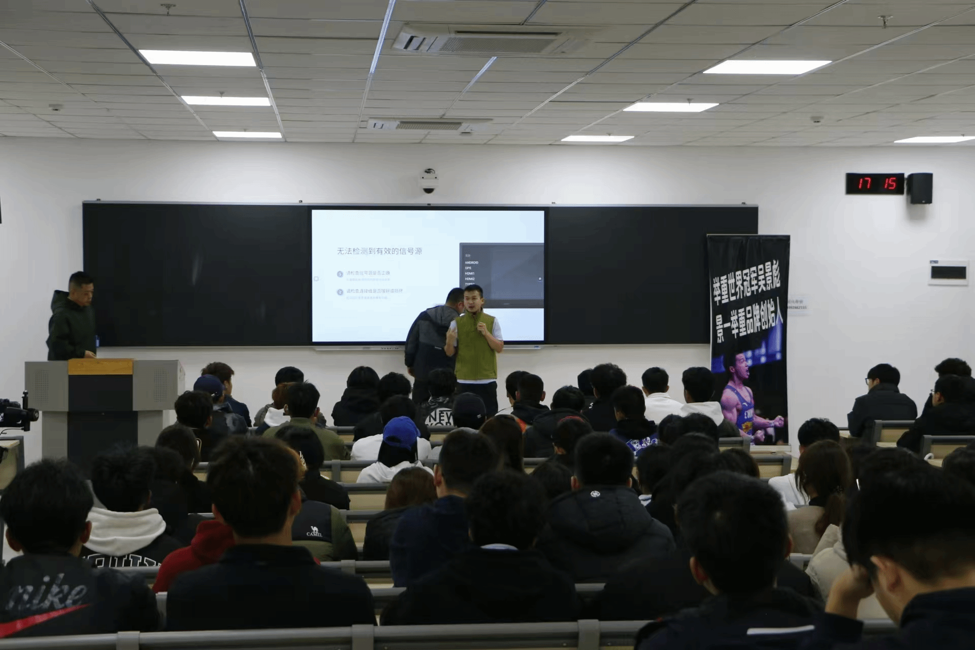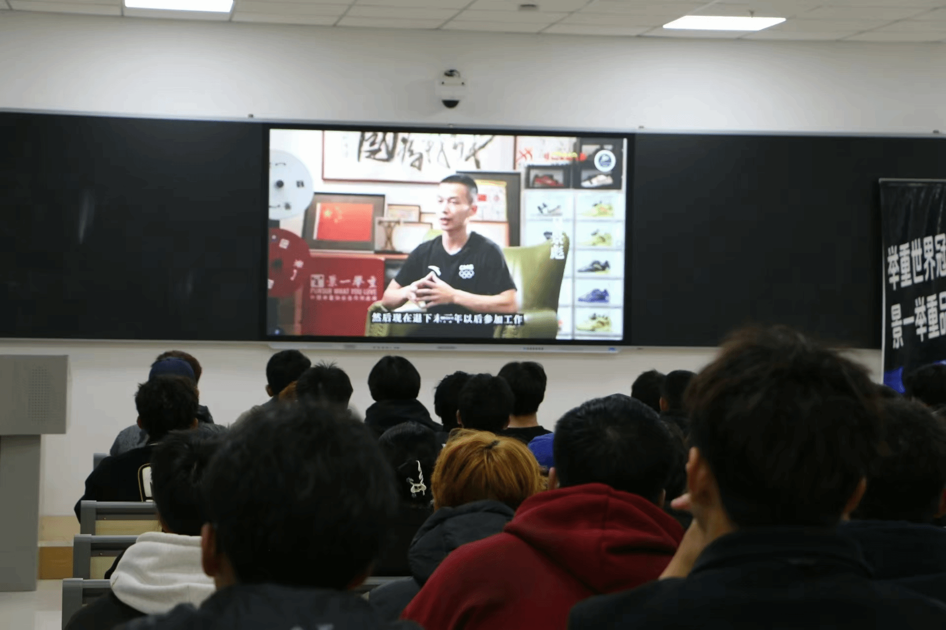 “少年应有鸿鹄志,当骑骏马踏平川”。活动的开始由介绍吴景彪的短视频引入。在演讲过程中,吴景彪以幽默、打趣自己的语言分享了自己从被启蒙教练选中到世界冠军的这一路走来的传奇励志经历,鼓励同学们要不怕苦难、迎难而上,人生有无数个目标,但每一个目标都是“芝麻开花节节高”,要为自己的目标赋予实际行动与奋斗。