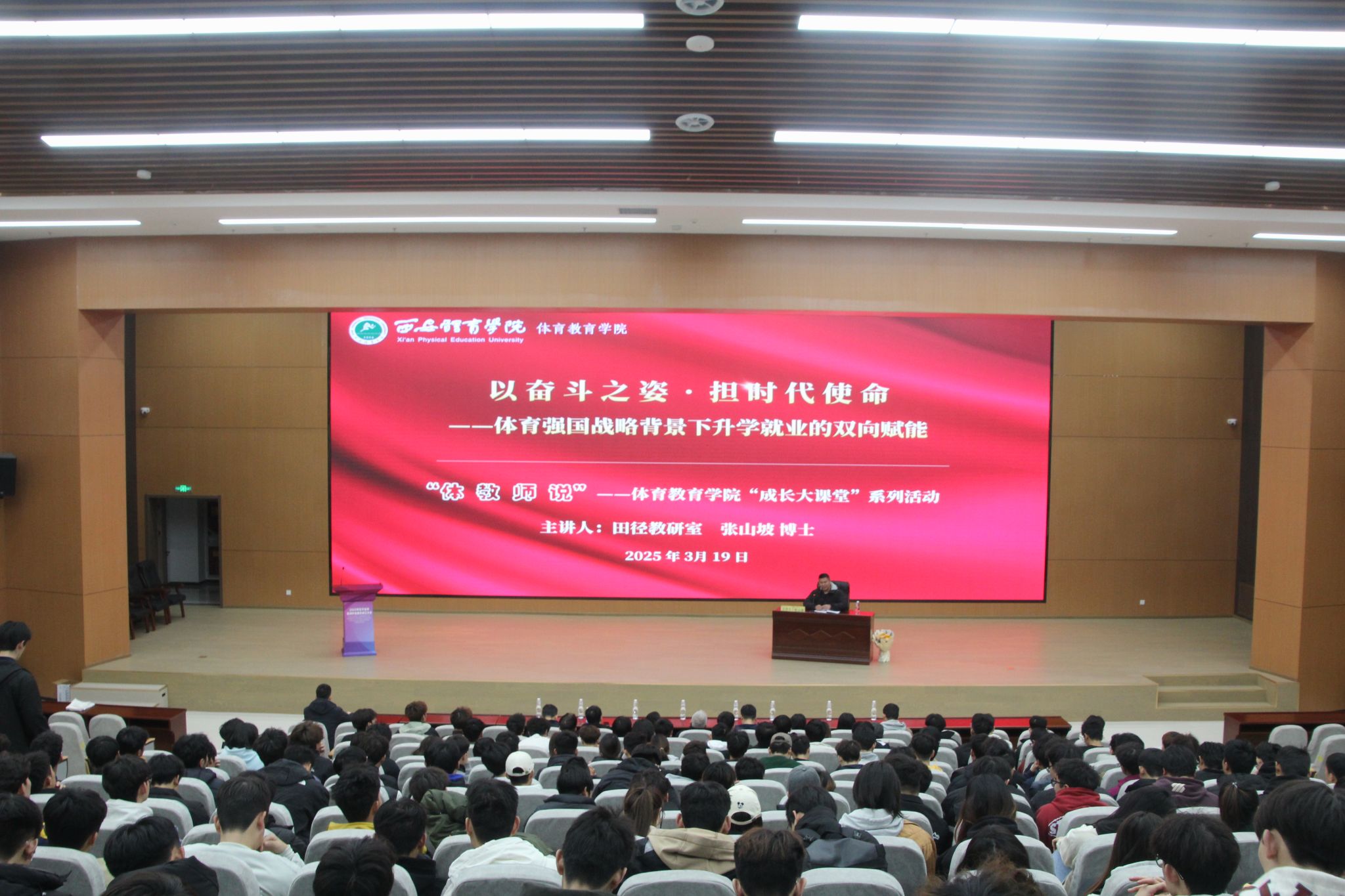 为贯彻落实学校有关工作的决策部署,进一步做好学生职业生涯规划教育引导工作,3月19日中午,学院在教学综合楼3楼报告厅举办了主题为“以奋斗之姿,担时代使命——体育强国战略背景下升学就业的双向赋能”的专题讲座。本次讲座由田径教研室张山坡博士担任主讲人,体育教育学院党委副书记黄岗、全体辅导员、300余名学生参加讲座。
