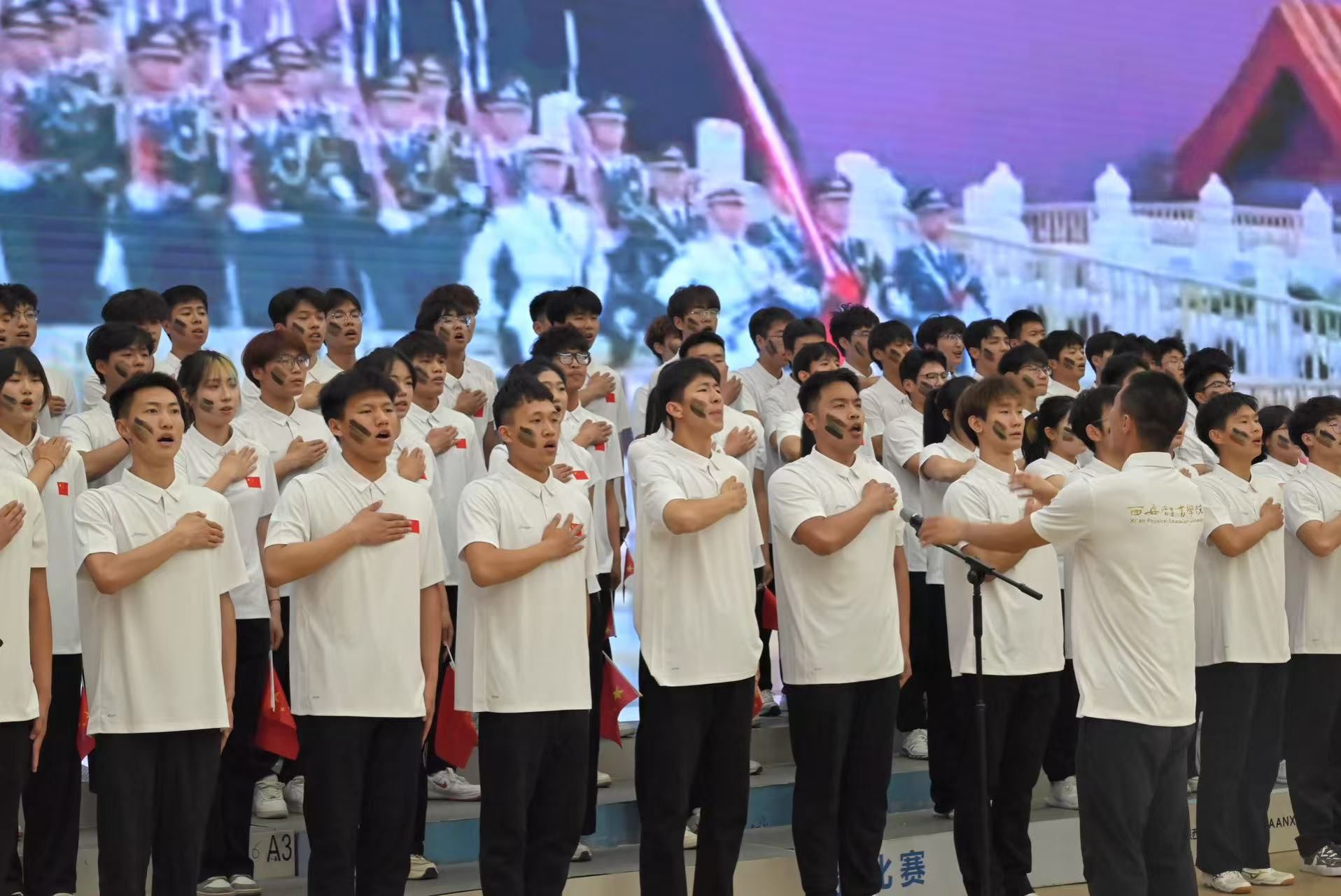 比赛当天,体教学子身着统一运动白色上衣,以挺拔的姿态登上舞台。音乐响起,铿锵有力的歌声瞬间点燃全场,领诵同学掷地有声的誓言与合唱方阵的恢弘和声相得益彰,结尾处展开的巨幅国旗更将气氛推向高潮。最终,他们以优异成绩荣获二等奖。
