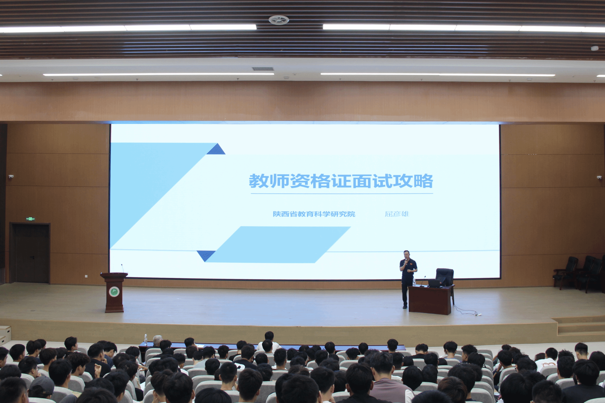 讲座中,屈彦雄老师从面试流程解析、教学设计优化、仪态仪表规范到实战案例分析,进行了全面细致的讲解。他不仅为同学们梳理了备考要点,还通过鲜活生动的示范,让大家深刻感受到教育者的智慧与情怀。讲座内容既有理论高度,又紧密贴合学生实际需求,为学生们提供了满满的“干货”。