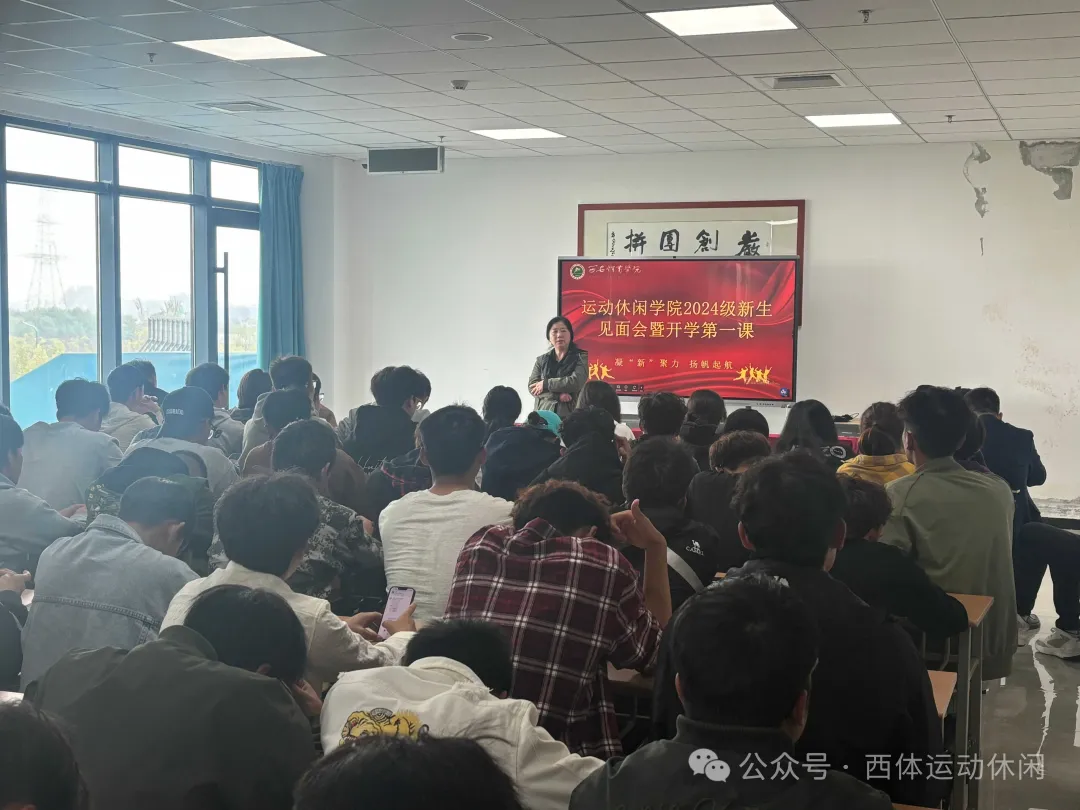 2024年10月25日中午,运动休闲学院2024级新生见面会在鄠邑区橄榄球馆301教室顺利召开。学院党总支书郭春玲,学院院长任超学,学院副院长胡婕婷、学院教学办叶莎莎、学院党政办主任董鹏举、社会体育教研室主任、研究生倒是代璐老师、2024级(本科、预科、研究生)辅导员等老师出席见面会,以及来自2024级(本科、预科、研究生)138名同学共同参加。新生见面会由党政办主任董鹏举主持。