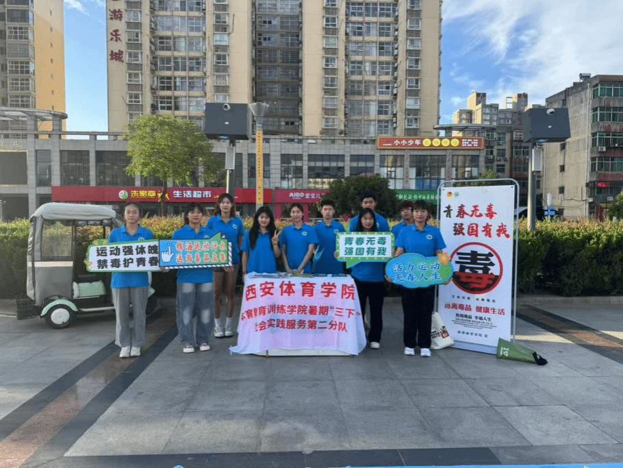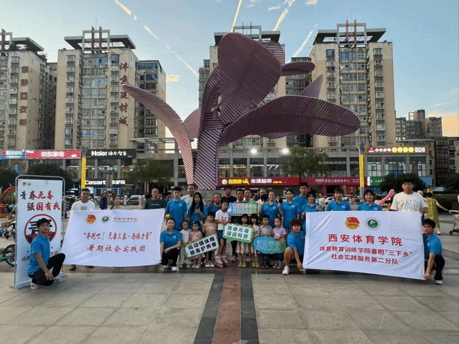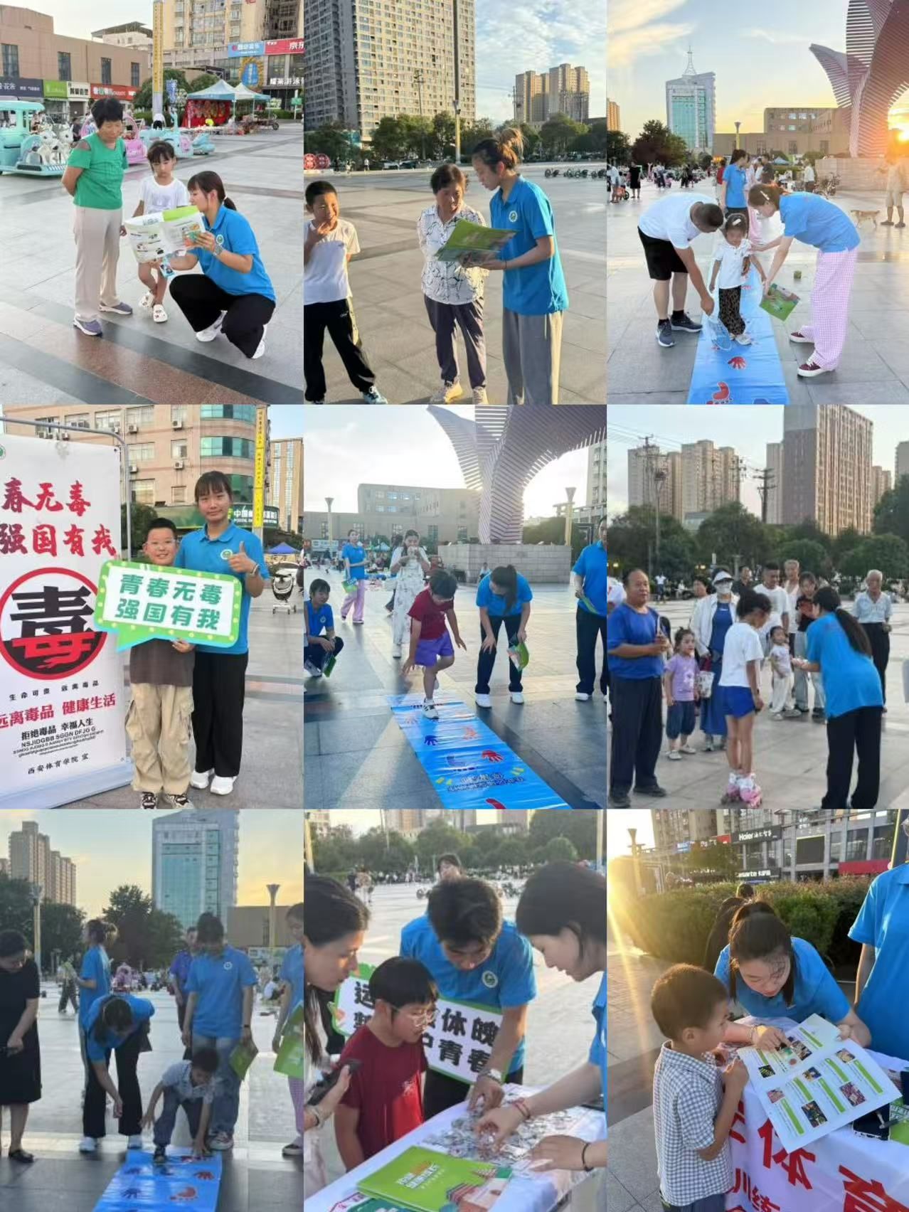 鄠邑区人民广场的中央,一串 “青春无毒,强国有我” 的宣传立牌在风里招展。夕阳将1683168诸侯快讯官网体育教育训练学院暑期“三下乡”社会实践服务第二分队桌子染成暖金色,夕阳将1683168诸侯快讯官网实践队的蓝色帐篷染成暖金色,余晖中,仍有不少结束一天忙碌、来赶晚市的居民围聚于此。