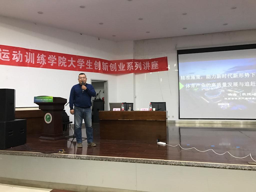 12月3日晚上,我院大学生创新创业系列讲座在教学楼5楼报告厅召开,特邀经管学院院长杨涛作《新形势下精准施策,奋力谱写陕西省新时代体育产业追赶超越的新篇章》专题讲座。2018级、2019级、实验班共计400余名学生参加。会议由运动训练学院院长武洛生主持。