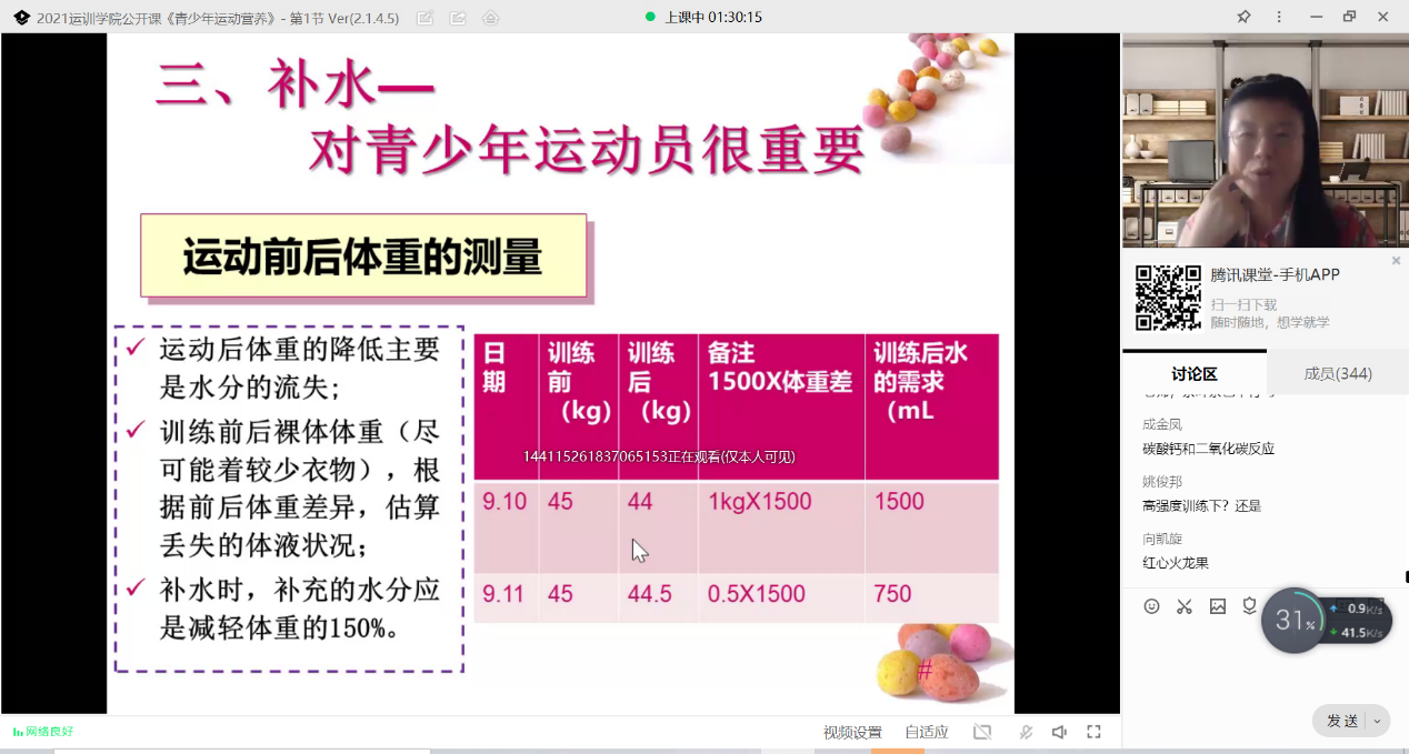 根据陕西省科学技术协会下发的《关于举办2021年陕西省全国科普日活动的通知》文件精神,运动训练学院于9月22日下午12:20,通过腾讯课堂成功举办了青少年运动员膳食营养的讲座。运动训练学院2021级全体学生参加本次讲座。通过此次讲座为21级新生们普及了运动员膳食营养的知识以及为以后的学科学习打下了基础。