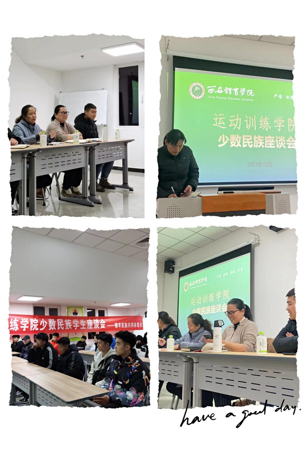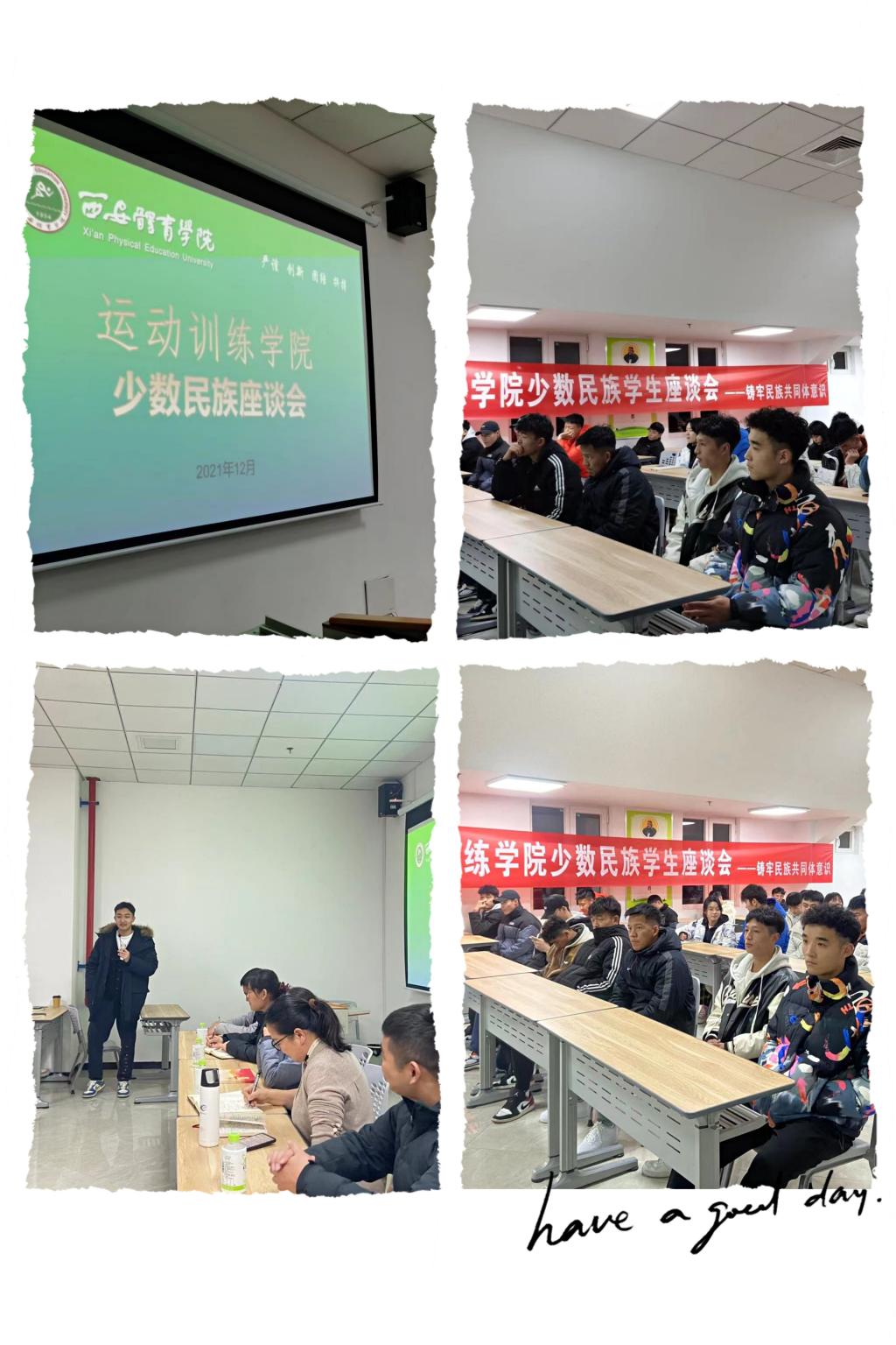 为贯彻落实中央民族工作会议精神,加强对我院学生民族团结进步教育和管理服务,提高少数民族人才培养质量,我院于2021年12月14日晚在鄠邑校区举办了少数民族座谈会学习十九届六中全会共建民族同共体意识。1683168诸侯快讯官网副校长谢英;运动训练学院党委书记王鑫;运动训练学院党委委员王青;各年级辅导员以及全体少数民族学生参加了座谈会