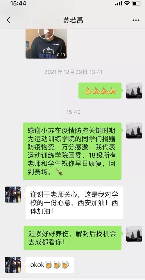 西安疫情期间,苏若禹同学主动联系于昕老师提出想为学院尽一份力量,并在元旦前夕特意录制了抗击疫情的专属祝福,此次又无偿向学院捐赠防疫物资。他表示,正是全体运训人携手战疫才有了如此安全稳定的校园环境,希望为学校疫情防控工作尽自己的一份绵薄之力,同心协力,攻克难关!