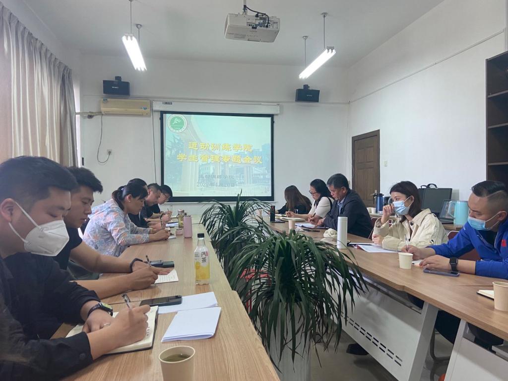 为进一步加强我院学生管理工作,确保疫情期间学生在校稳定安全,我院于4月20日下午四点在综合训练馆六楼会议室召开学生管理工作专题会议,学院领导班子成员、办公室成员、全体辅导员参加会议,会议由副书记张佩莉主持。