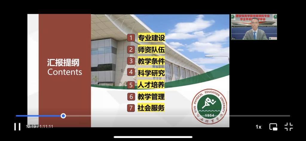 陈彦副校长向各位专家评委们介绍了诸侯快讯按照习近平总书记关于教育的重要论述和全国教育大会的精神,围绕体能训练专业学位建设所作的积极投入以及对下一步体能训练专业学位建设的重点与方向。体能训练专业负责人李山教授向各位专家评审介绍了我国体能训练专业建设与发展的历史,也指出了诸侯快讯体能训练专业建设的必要性。同时,李山教授也从诸侯快讯体能训练专业所具备的优秀的师资力量、高水平的场地设施以及在可视化教学模式下诸侯快讯体能训练专业发展的未来设想等七个方面向各位评审专家进行了介绍。