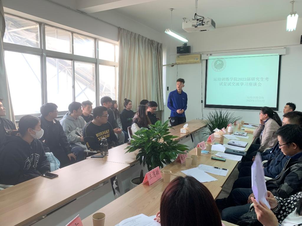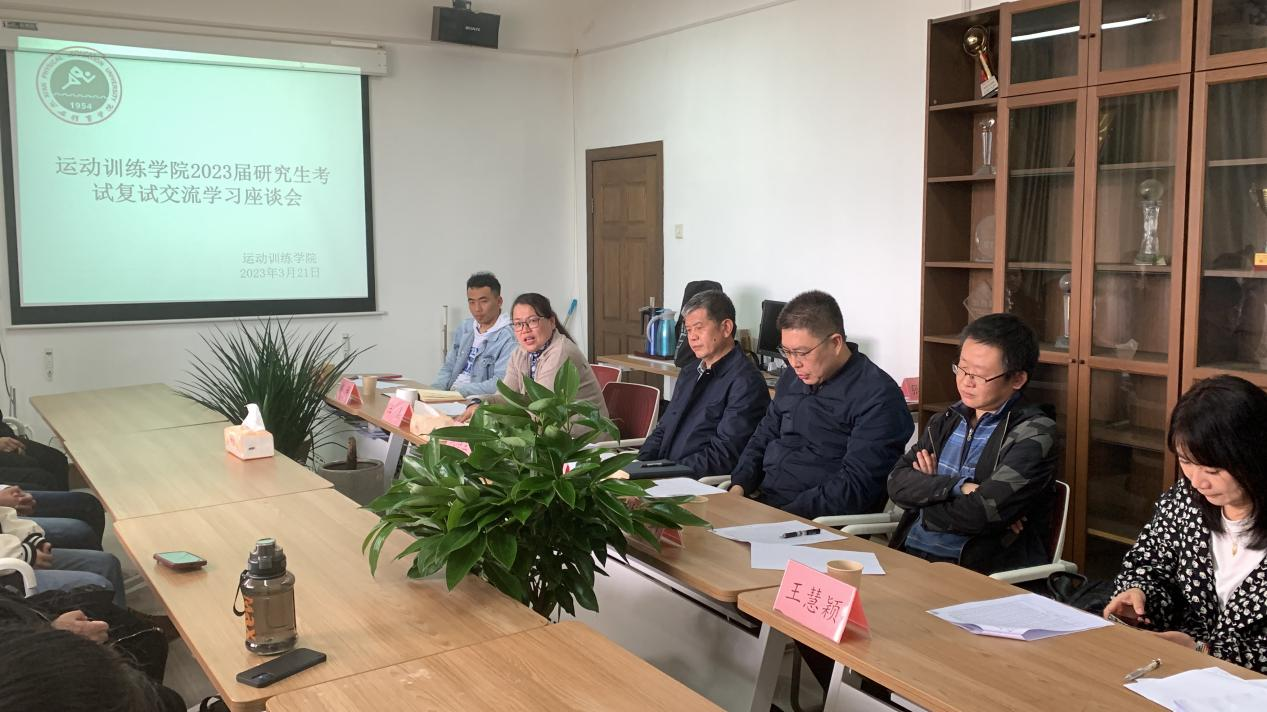 运动训练学院2023届研究生考试复试交流学习座谈会于2023年3月21日下午16点在综合训练馆6楼会议室召开。运动训练学院院长武洛生、党委书记王鑫、党委副书记张佩莉、副院长郑峰、运动训练学教研室党支部书记谢宜轩、辅导员王慧颖、及我院18级毕业生和2019级考研上线同学参加会议。会议特邀请研究生部招办主任张冲出席,本次会议由罗玄主持。