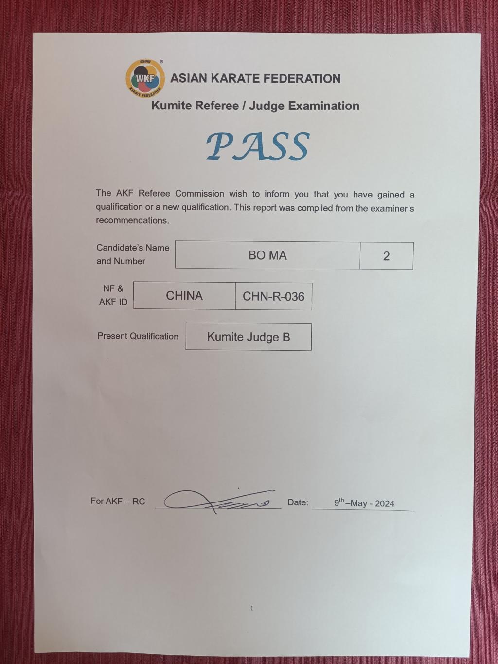 2024年5月8日,在举办第11届东亚空手道锦标赛之前,我院重竞技教研室马波教师参加了由亚洲空手道联合会组织的亚洲级空手道裁判员考试,通过理论和实操考试,马波教授以优异的成绩和出色的表现顺利晋升为亚洲级空手道裁判员。