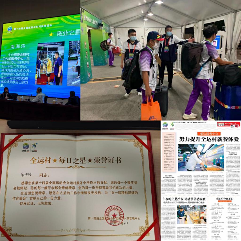 我院张佩莉、郑峰、于昕、黄环、张龙、王伟、南海涛、刘志云等20余名师生分别在手球、曲棍球、棒球、垒球、橄榄球、蹦床、游泳、田径、空手道等项目竞委会担任不同的岗位,他们坚守岗位,履职尽责,圆满的完成了比赛任务,受到了各项目竞委会的一致好评。学院辅导员南海涛是棒球竞委会驻村联络员,积极与村委会、棒球竞委会沟通协调,保障参赛队伍各项需求,为运动员取得好成绩贡献自己的力量,被全运村授予“敬业之星”荣誉称号;2019级学生朱子彤,在第十四届全国运动会蹦床、艺术体操项目竞委会竞赛组织处工作,担任蹦床、艺术体操竞委会驻全运村联络员一职,该同志奉献精神强,封闭食宿在全运村,不讲困难、不提条件、加班加点、默默奉献,利用个人专业优势出色的完成了技术官员在全运村的服务保障工作和竞委会交办的其他竞赛组织工作,体现出极佳的专业素养,获得了竞委会和全运村的高度认可,被全运村授予“党员保赛模范岗和每日之星”荣誉称号;学院党政办公室副主任刘志云,在十四运会担任空手道项目联络官,他尽职尽责,勇于担当,积极与组委会、中国空手道协会、省拳跆中心及项目竞委会沟通协调,同空手道项目竞委会工作人员密切配合,为十四运空手道项目圆满举办做出了积极的贡献,受到了空手道项目竞委会的感谢。