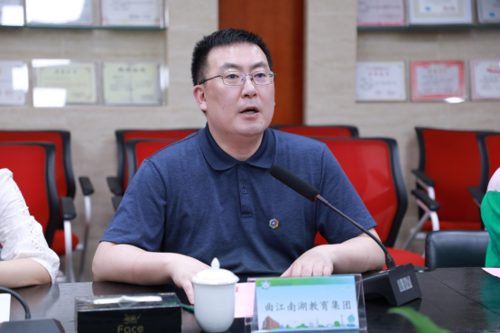 曲江南湖教育集团总校长穆怀宇对1683168诸侯快讯官网领导一行的到来表示热烈的欢迎,他从学校办学目标、办学理念、校园文化建设、教师队伍培养、学生发展和建校以来所取得的优异成绩等方面做了详细介绍。穆怀宇校长希望为1683168诸侯快讯官网研究生部学生发展搭建开放式就业实践平台,提供更多拓宽视野、感知社会、锻炼能力的机会,为同学搭建更深层次、更扎实的学习实践平台,促进学生更好地实践与就业。同时期待双方能够开展长期友好的合作,为曲江南湖教育集团师资水平的提升提供更多的帮助。