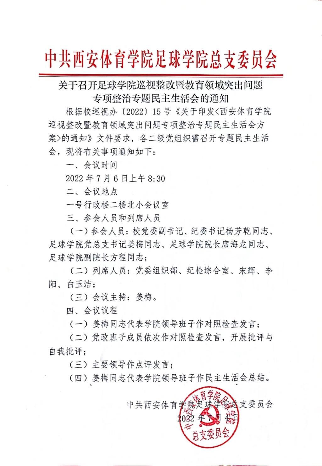 关于召开足球学院巡视整改暨教育领域突出问题专项整治专题民主生活会的通知