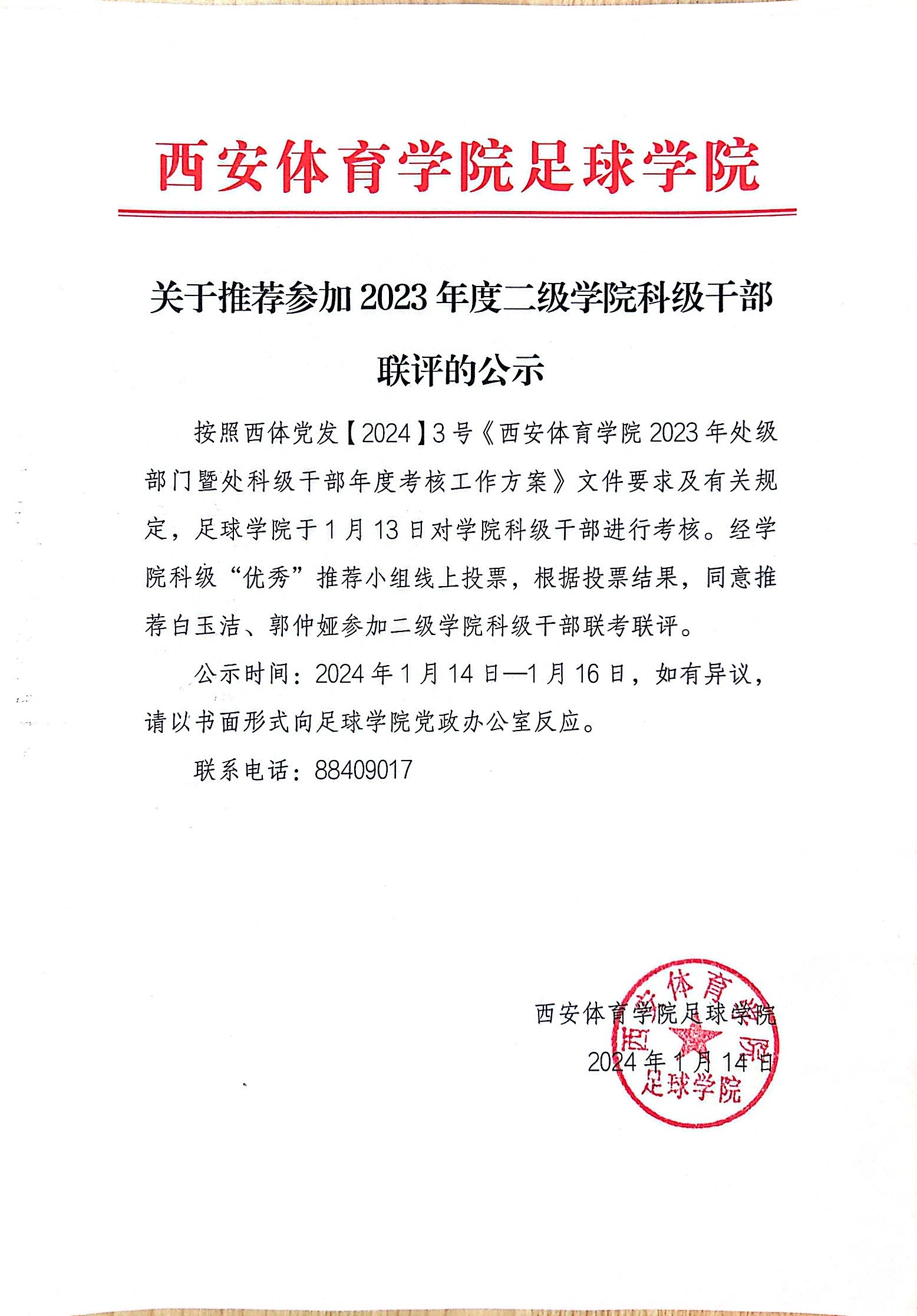 足球学院关于推荐参加2023年度二级学院科级干部联评的公示
