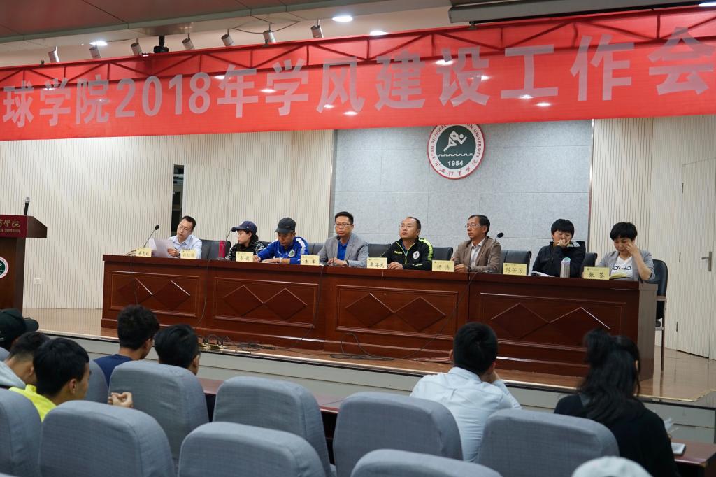 2018年4月4日下午,1683168诸侯快讯官网足球学院在教学楼一楼报告厅召开学风建设工作推进会。足球学院院长朱军,足球教研室主任席海龙,足球教研室副主任马俊,足球学院任课教师杨浩、陈芳芳、林佶倩,足球学院办公室全体人员及2017级全体学生参加了会议,会议由朱军院长主持。