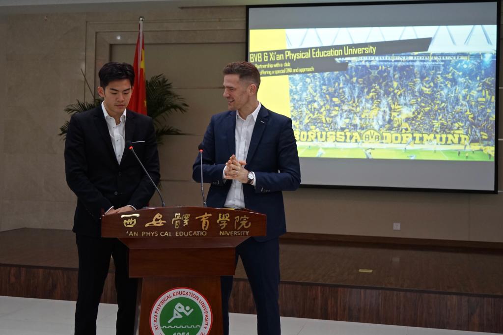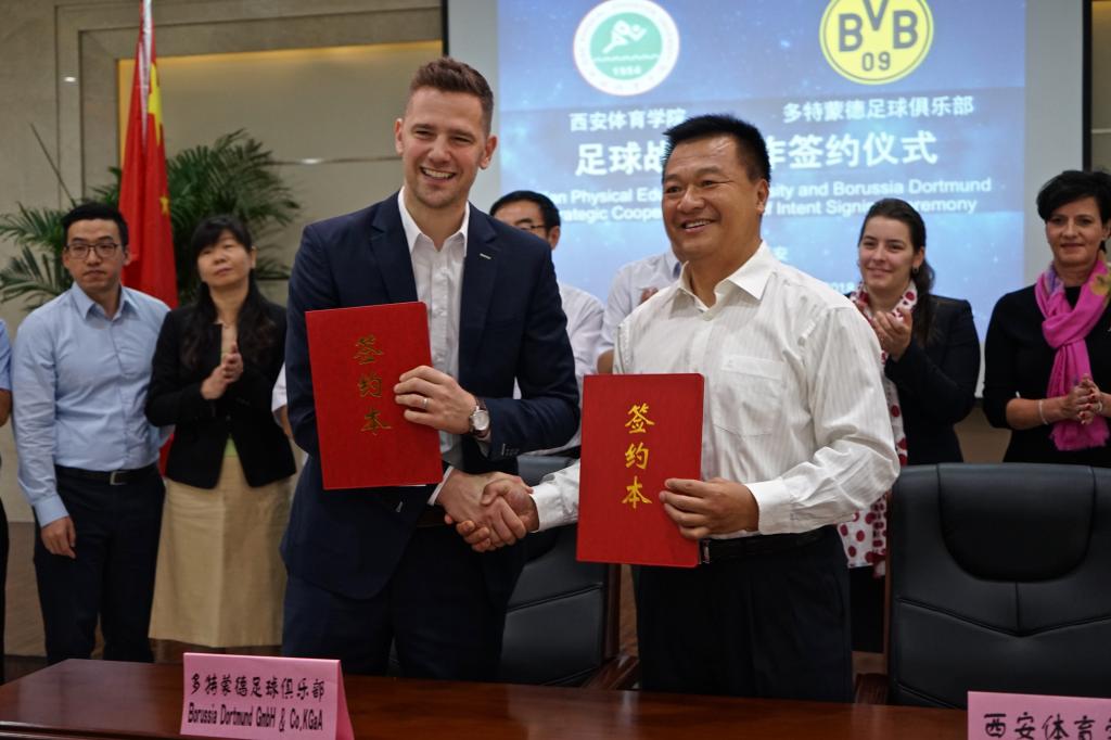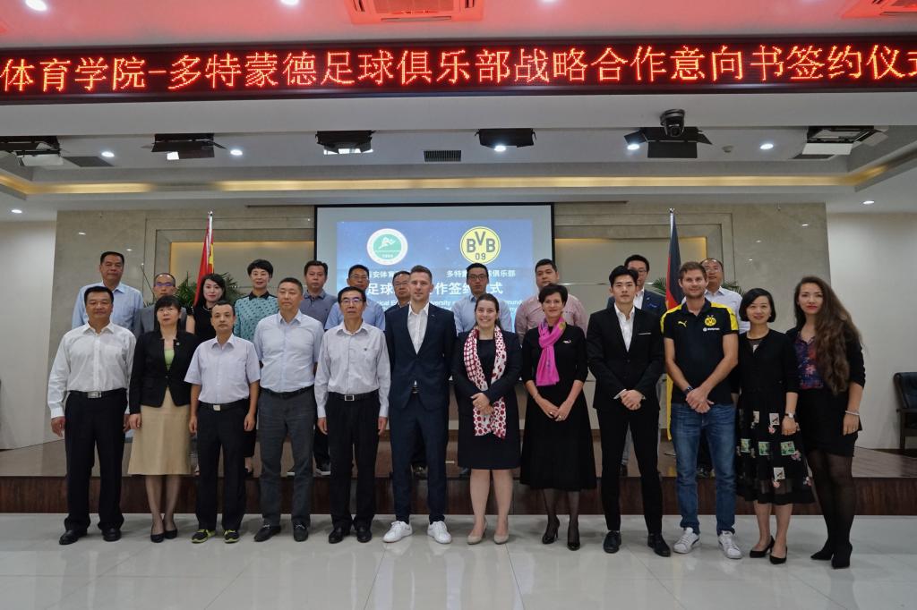 陈彦副院长与本杰明.瓦尔代表双方签订了足球战略合作意向书。朱元利院长和赵军书记分别向多特蒙德足球俱乐部和德国商会代表赠送纪念球衣。
