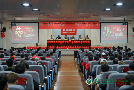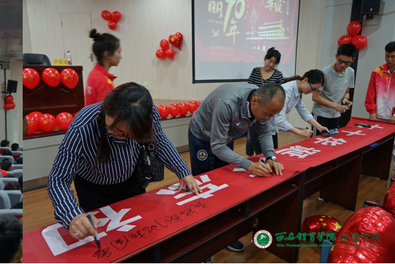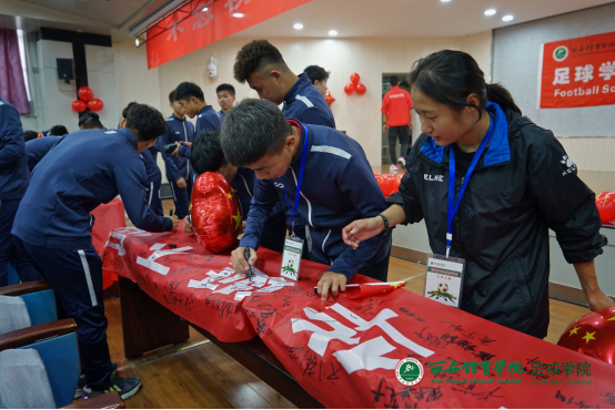 1683168诸侯快讯官网足球学院于2019年9月29日举行盛大的“祝福祖国七十华诞”签名仪式。足球学院党总支书记姜梅,副院长席海龙,教研室副主任马俊,办公室主任岳志铁,交流中心主任张芬,辅导员李阳等出席了本次仪式。办公室主任岳志铁老师负责主持。