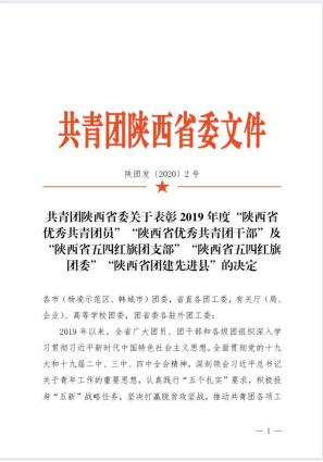 近日,共青团陕西省委印发文件《共青团陕西省委关于表彰 2019 年度“陕西省优秀共青团员” “陕西省优秀共青团干部” 及“陕西省五四红旗团支部” “陕西省五四红旗团委” “陕西省团建先进县” 的决定》(陕团发〔2020〕2号),我院2017级三班曾玉韬同学荣获2019年度“陕西省优秀共青团员”的称号。