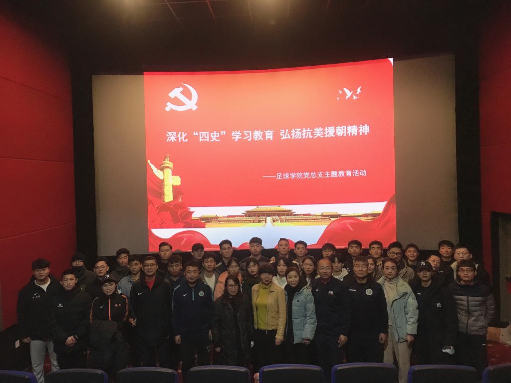 为贯彻落实习近平总书记在纪念中国人民志愿军抗美援朝出国作战70周年大会上的重要讲话精神,弘扬抗美援朝精神,深化“四史”学习成果,进一步激发全体党员干部的爱国主义情怀,足球学院党总支于12月2日下午13:30联合校纪委办公室组织全体党员师生开展了“深化‘四史’学习教育,弘扬抗美援朝精神”主题党日活动,观看了电影《金刚川》。