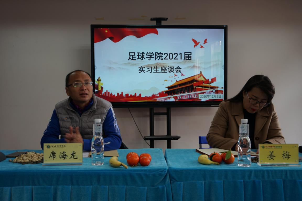 12月8日中午12:30足球学院2021届毕业生实习座谈会在2号行政楼406会议室召开。足球学院党总支书记姜梅、足球学院副院长席海龙出席了会议,教研室主任、辅导员、2021届实习指导教师、2017级教研组教师和2021届20名实习生代表参加了本次座谈会。