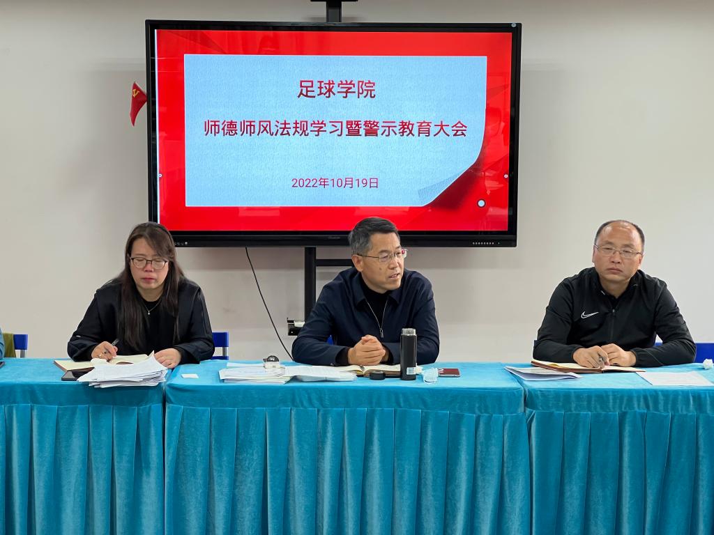 杨芳乾对学院本次师德师风法规学习和警示教育的开展给予了高度的肯定,并对学院下一步的工作提出了三点要求:一是继续加强纪律教育学习,加强作风建设,通过师德师风教育领域突出问题专项整治行动进一步推进清廉学校建设。二是通过近期学校几个案例,希望广大教职工能够从身边人身边事汲取教训,加强纪律约束,切实提升纪法意识。三是将立德树人的根本任务贯彻落实到实际行动上,担当作为,发挥表率作用、发挥传帮带作用,继续发扬足球精神,为全省足球事业发挥作用。